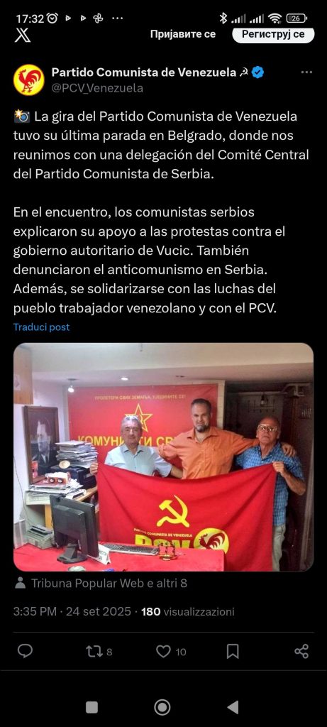 Dana 20. septembra 2025. godine članovi Izvršnog sekretarijata Partije Komunisti Srbije imali su radni sastanak sa našim drugom iz Venecuele. Drug Dobson nas je upoznao sa istorijatom KP Venecuele i trenutnim stanjem u njihovoj zemlji.